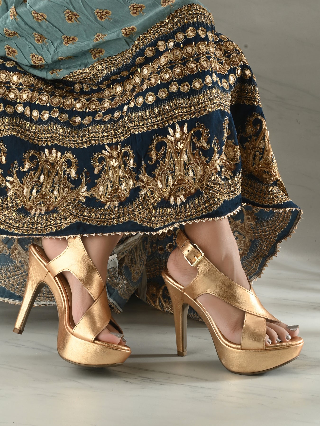 Occasion - Party & Daily Ankle Height- 5 cms Type- Ethnic Pattern- Solid Upper Material- Gold Metallic Leather Inner Material- Synthetic Lining Sole Material- TPR Closure- Buckles Care Instructions- Do not wash; only use shoe cream and liquid spray. Shipping Policy- Orders will be delivered within 5 to 7 working days.