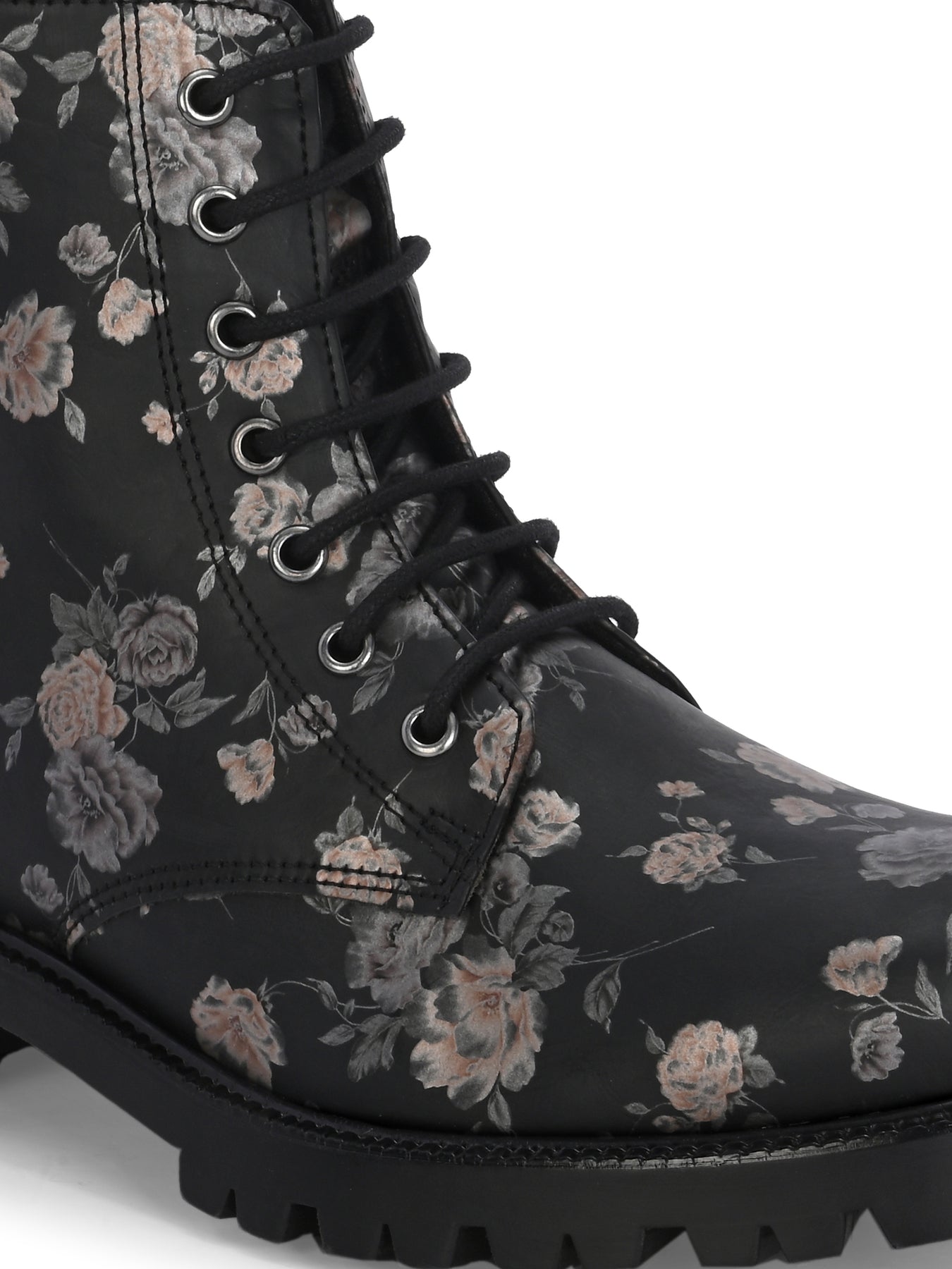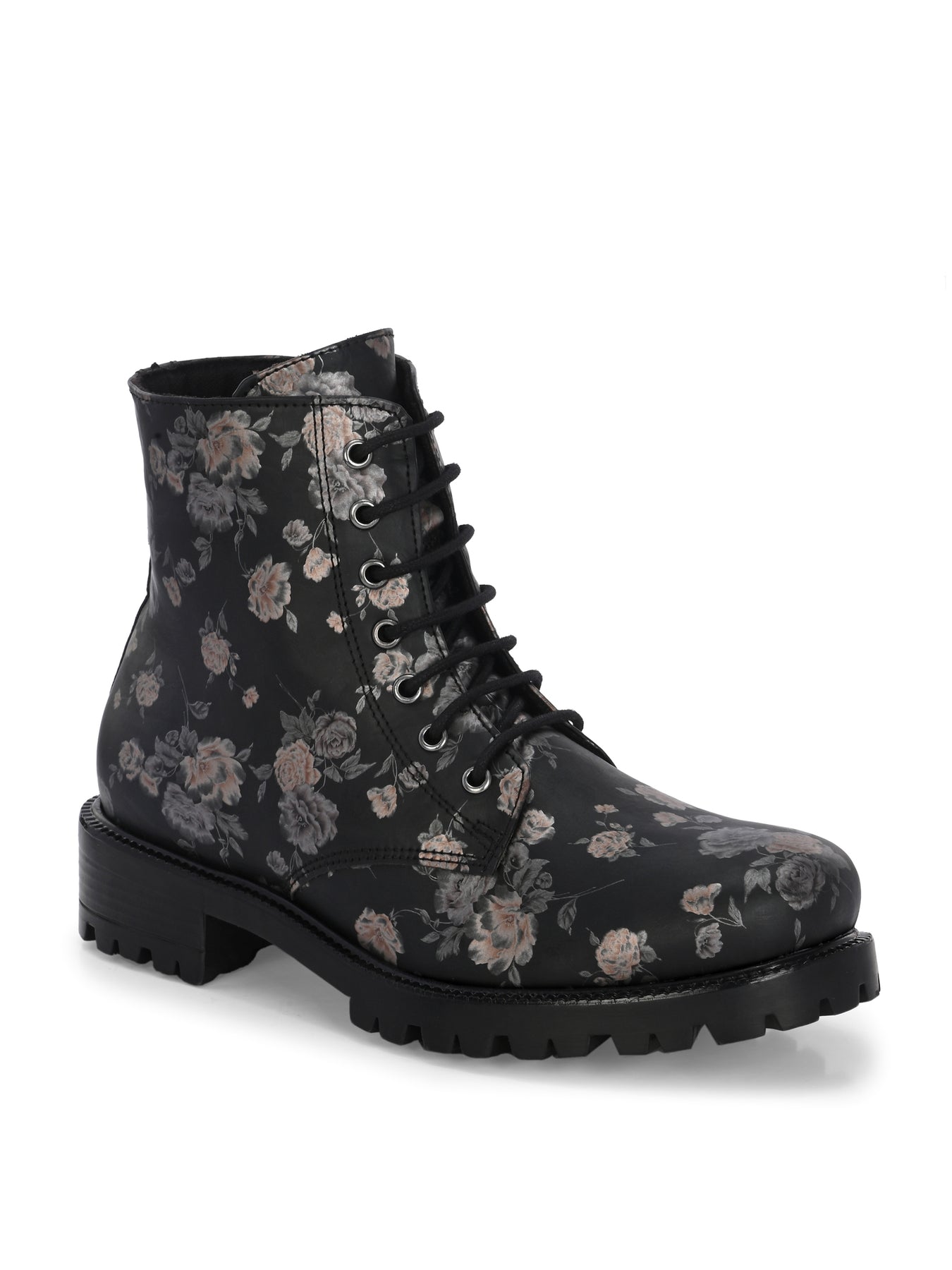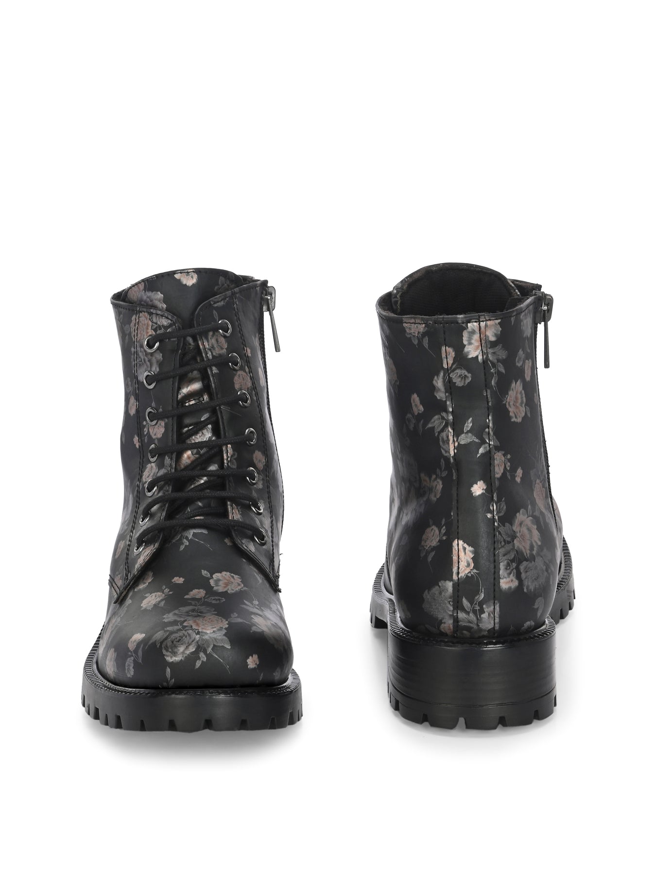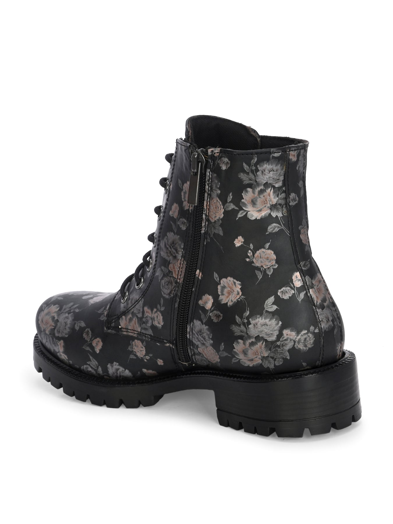 CARLO ROMANO BY WASAN BLACK COLOR VEGAN LEATHER FLOWER PRINT LACE-UP ANKLE BOOTS WITH ZIP FOR WOMEN