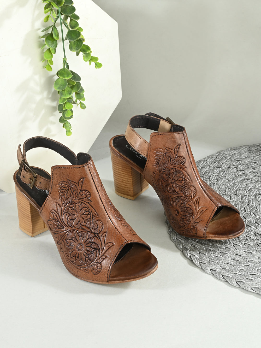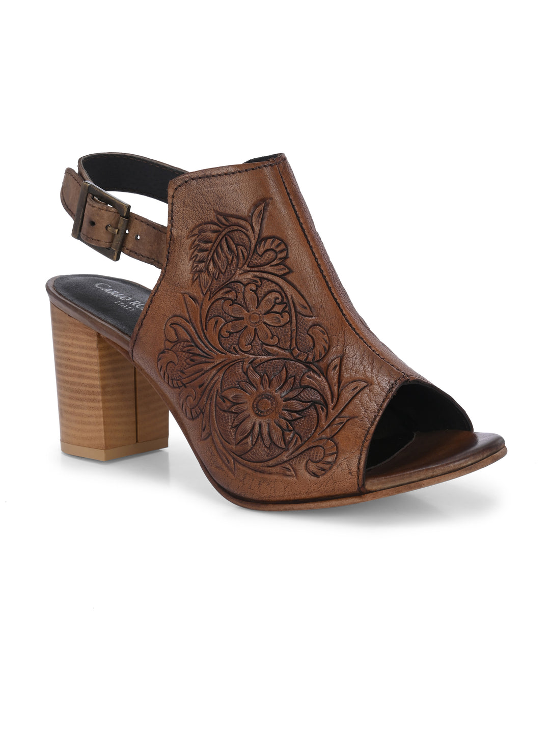 CARLO ROMANO BY WASAN TAN COLOR GENUINE TERRACOTTA LEATHER FLORAL PRINT SANDAL FOR WOMEN
